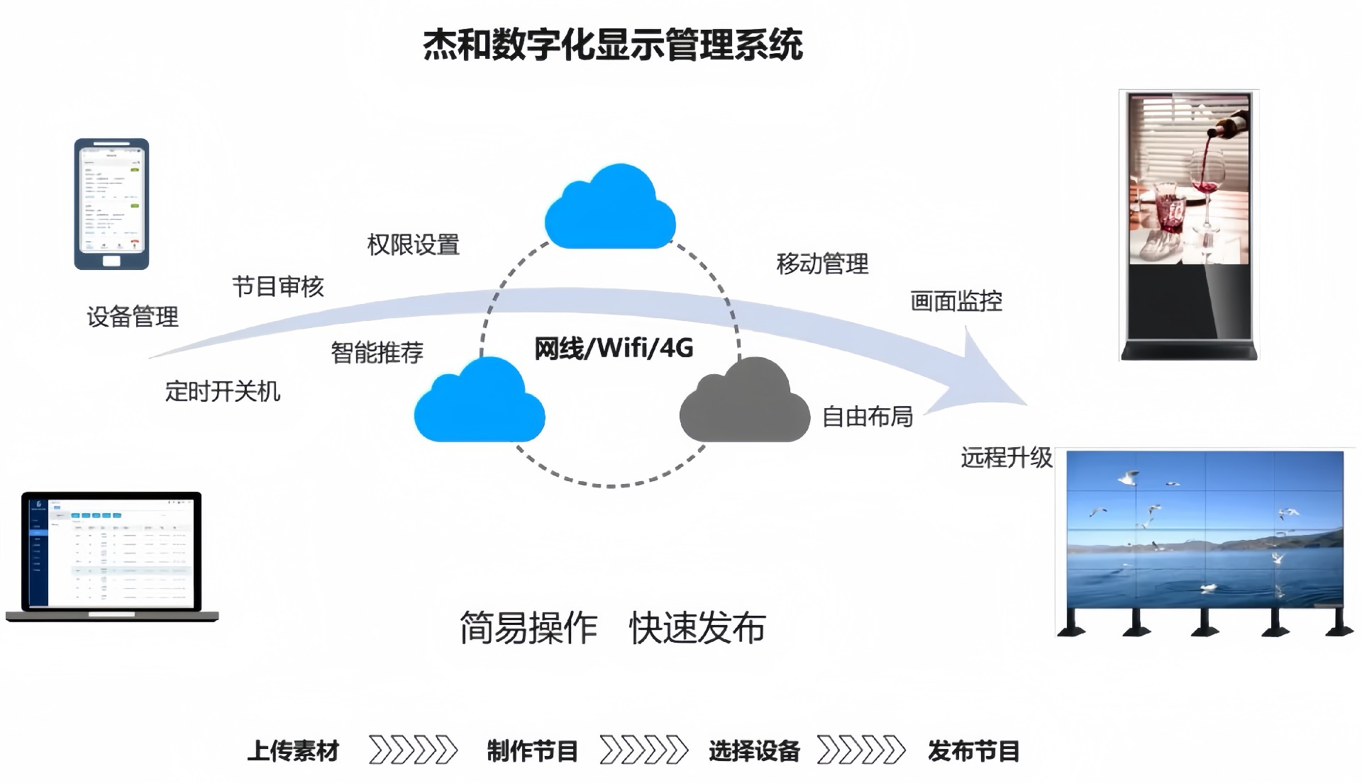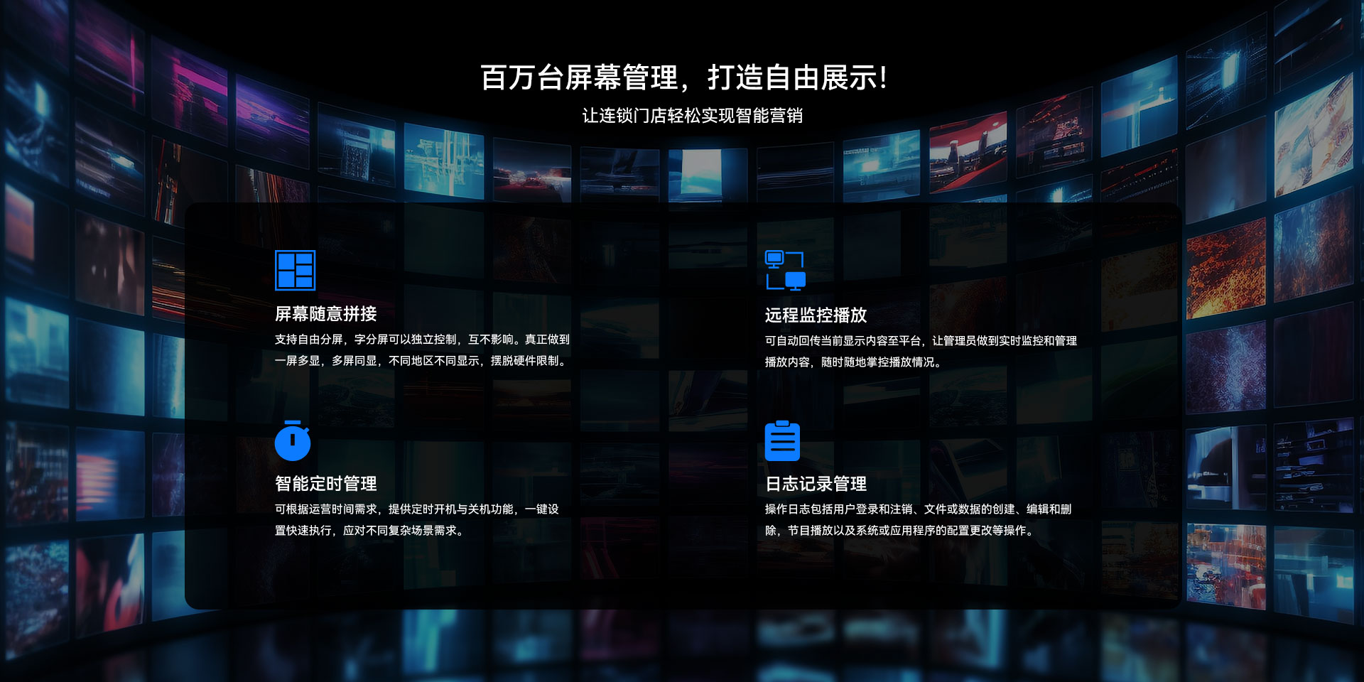 为此,沐鸣科技打造一整套数智化信息管理系统,该系统由服务器(后台)管理端和设备播放端组成,运用显示屏将企业宣传、广告展示、紧急通知等信息全面展示在大众面前。通过将音视频图文、网页资讯、时间天气、字幕等多样化内容的组合,形成一段精美的节目,并使用网络作为载体,随时将制作好的节目推送到各地的媒体设备上进行播放。